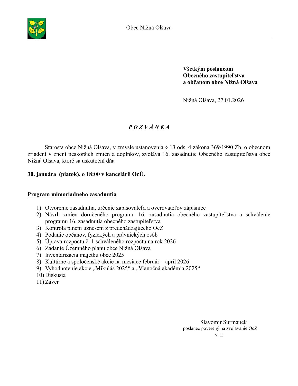 • Pozvánka na 16. zasadnutie OZ